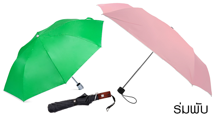 - แบบร่มพับ เป็นรูปแบบร่มของชำร่วยอีกรูปแบบหนึ่งที่ได้รับความนิยมไม่แพ้แบบร่มตอนเดียวเลยก็ว่าได้ เพราะรูปแบบร่มที่ถูกออกแบบดีไซด์ขึ้นมาเพื่อให้มีขนาดเล็กกะทัดรัดพกพาง่าย เพราะแกนร่มสามารถยืดพับเก็บได้ โดยจำนวนแกนนั้นจะขึ้นอยู่กับแต่ละแบบร่ม เช่น ร่มพับ2ตอนก็จะมีแกนร่มให้ยืดออกได้ 2สเต็ปด้วยกัน หรือร่มพับ3ตอน ที่มีแกนร่มให้ยืดออกได้ถึง3สเต็ปด้วยกัน และในปัจจุบันนี้ก็มีร่มพับที่ถูกออกแบบดีไซน์ให้มีแกนมากสุดคือ ร่มพับ5ตอน ที่มีแกนร่มให้ยืดออกมากสุดถึง 5 สเต็ป ทำให้ตัวร่มนั้นมีขนาดที่เล็กเป็นอย่างมาก เหมาะที่จะสั่งทำร่มเพื่อนำมาเป็นของชำร่วยในงานต่างๆได้เป็นอย่างดี