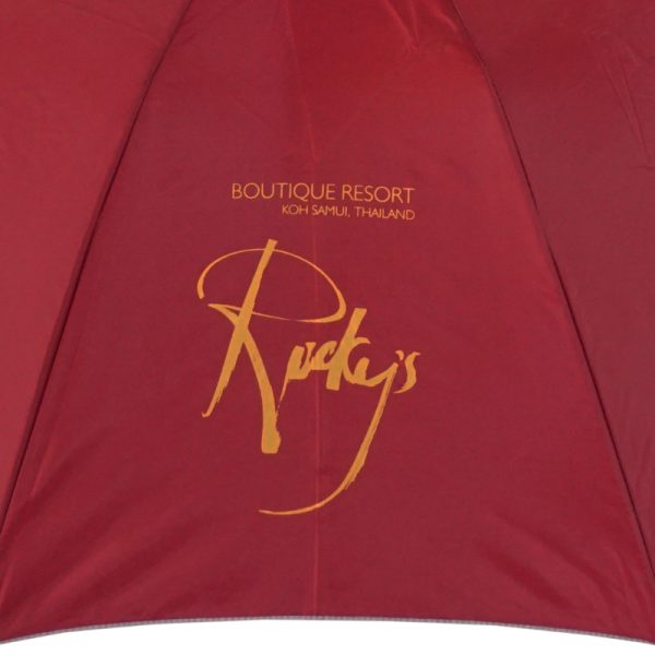 ร่มพับ2ตอน ขนาด 21นิ้ว สีเลือดหมู งานสกรีน 1 สี 1 ช่อง สกรีนโลโก้ Ruckys เป็นร่มที่มีสีสันสดใสเด่นสะดุดตา มองเห็นงานสกรีนโลโก้ได้อย่างชัดเจน ตัวร่มผลิตด้วยวัสดุคุณภาพดี แข็งแรงทนทาน เหมาะแก่การใช้งานได้ทุกโอกาส เป็นรูปแบบร่มที่น่าสนใจอีกรูปแบบหนึ่ง ลูกค้าสามารถปรับเปลี่ยนโลโก้หรือสีของผ้าร่มได้ตามที่ลูกค้าต้องการ